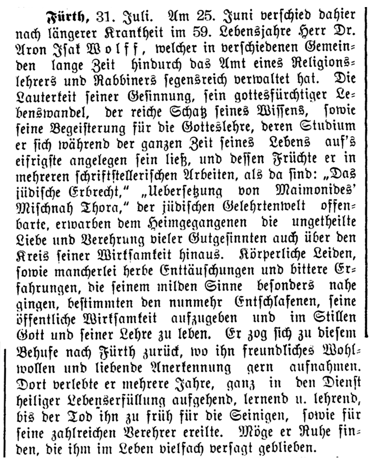 | Beschreibung | Nachruf Aron Isak Wolff in Der Israelit vom 6. August 1900 | ||