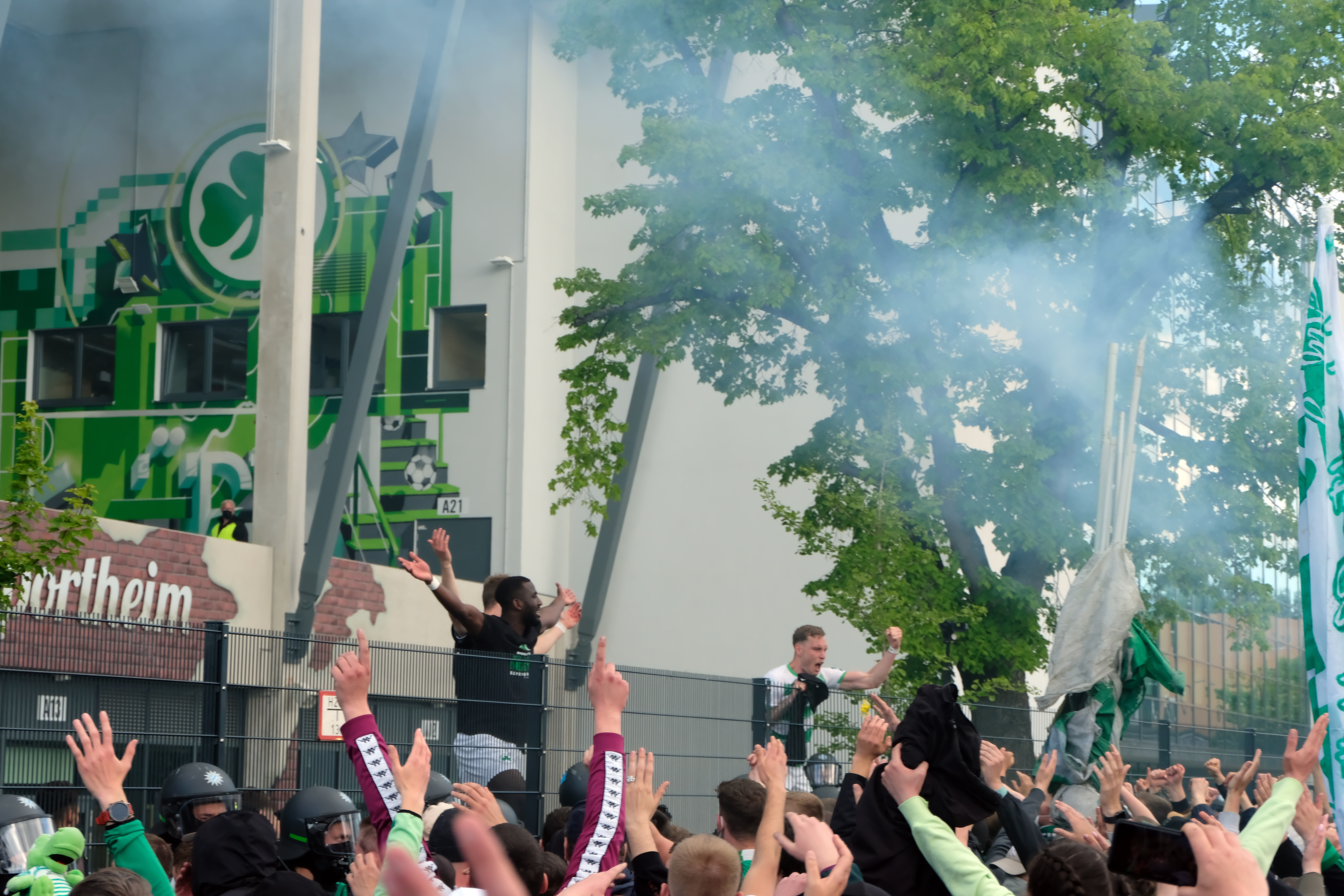 | Beschreibung | Einige Spieler der Spielvereinigung kamen am letzten Spieltag nach dem 3:2 Heimsieg gegen Fortuna Düsseldorf direkt zu den Fans - Aufstiegsfeier 2021 der Spielvereinigung im Mai 2021 | ||