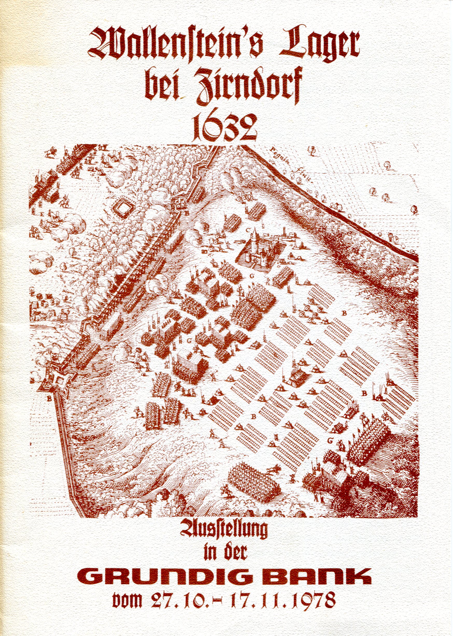 | Dateiinfo (Bild-Unterschrift und Info-Box, automatisch erstellt) | Broschüre zur Ausstellung "Wallenstein´s Lager bei Zirndorf 1632" in der Grundig Bank 1978 Urheber: Grundig-Bank<br>Erstellungsdatum: 27. Oktober 1978<br>Lizenz: copyright | ||