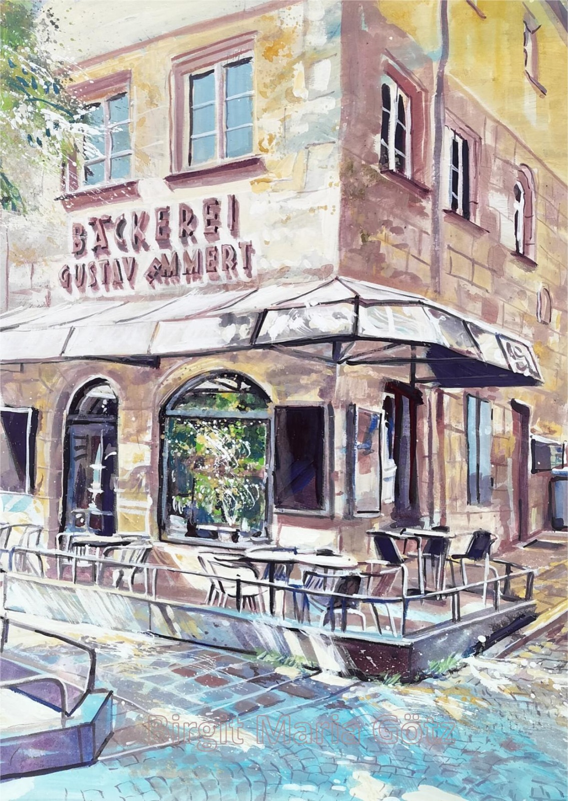 | Beschreibung | Bäckerei Emmert (heute Meisengeige) in Nünberg - Gemälde von Birgit Maria Götz | ||