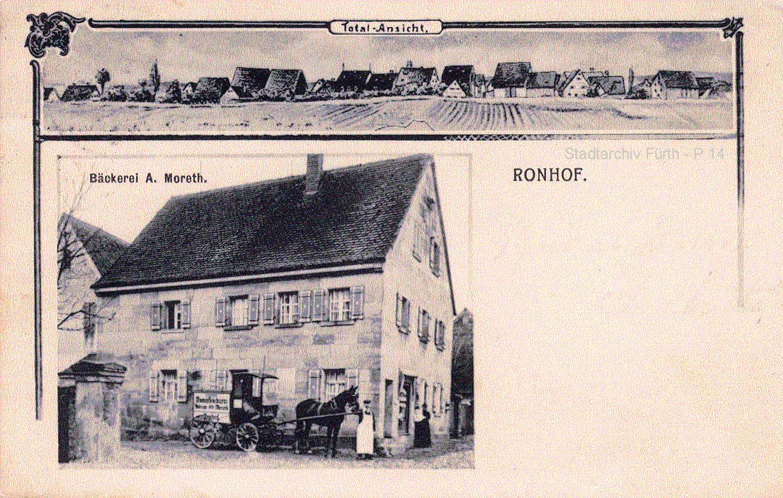 | Dateiinfo (Bild-Unterschrift und Info-Box, automatisch erstellt) | Die Bäckerei Moreth, hier noch in Ronhof, ca. 1880 Urheber: unbekannt<br>Erstellungsdatum: 1880<br>Lizenz: Bildlizenz-Stadtarchiv | ||