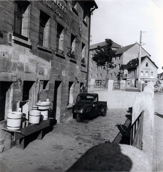 Die Königstraße 2 ist nach dem Krieg, Anfang der 50er, zur Büttnerei geworden. Den Balkon der "Gräfin", bzw. die Bedachung der Beschlagstelle ist entfernt worden. Am hellen Sandstein ist zu erkennen, wo der Balkon ehedem angebracht war. Vor dem Haus das Dreirad "Goli" von Borgward in Bremen. Im Hintergrund das Fischhäusla (Würzburger Straße 1) und die nach dem Krieg wieder aufgebaute Förstermühle.