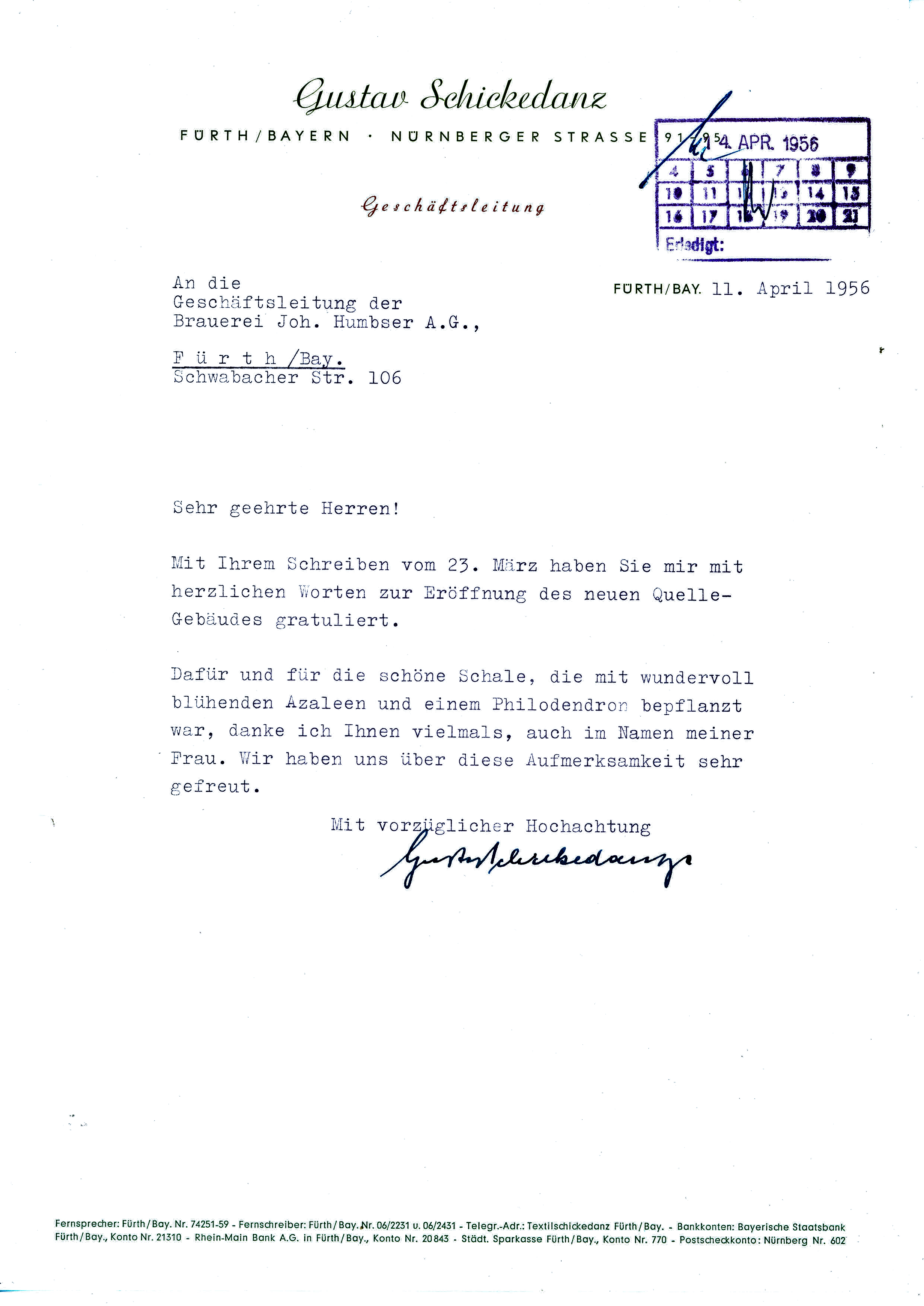 | Beschreibung | Briefkopf mit Unterschrift von Gustav Schickedanz, April 1956 | ||