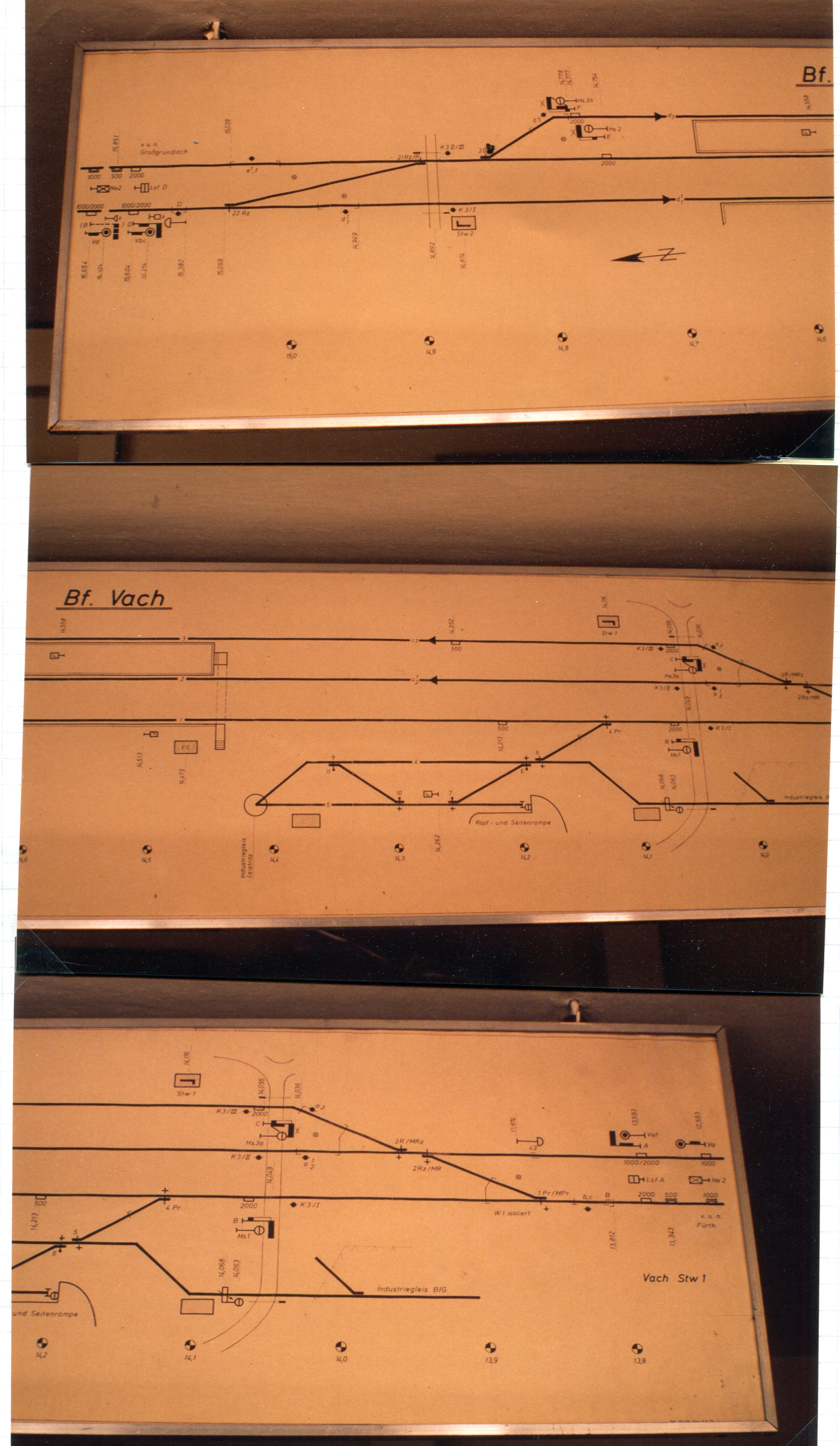 | Beschreibung | 1991: Gleis- und Spurplan vom Bahngelände am Bahnhof Vach aus dem Stellwerk 1. | ||