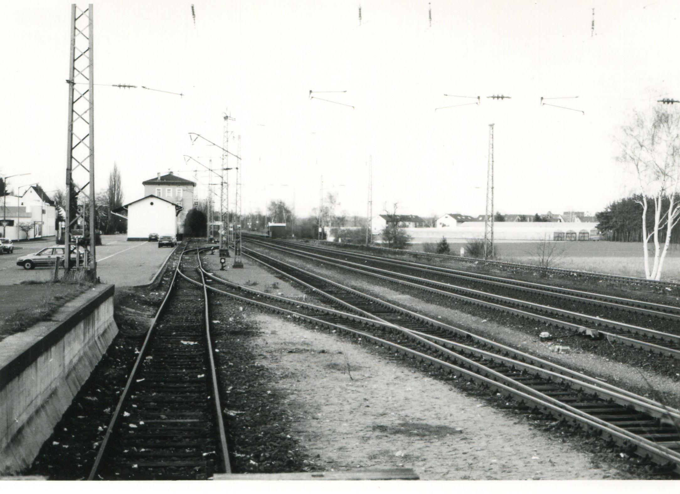 1990: Blick von der Laderampe auf den Bahnhof Vach und die Gleisanlagen. Im Hintergrund Herboldshof