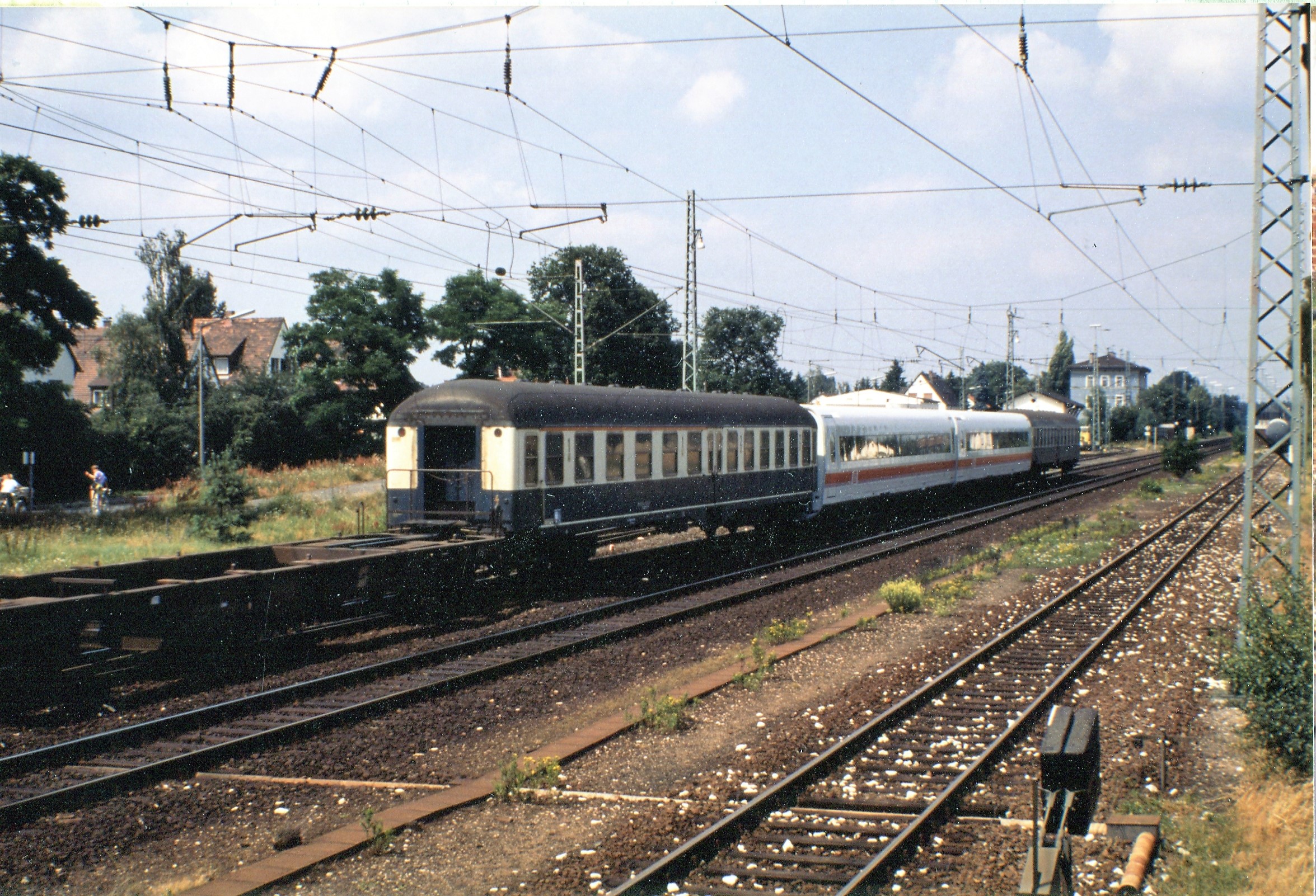 | Beschreibung | 1991: Durchfahrt eines Güterzuges mit eingestellten ICE- und IC Waggons am Bahnhof Vach | ||
