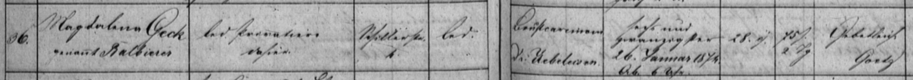 | Beschreibung | Eintrag Beerdigungsbuch 1874, Magdalena Geck (genannt Balbierer) | ||