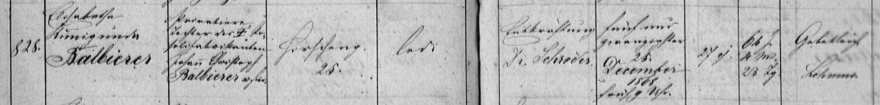 | Dateiinfo (Bild-Unterschrift und Info-Box, automatisch erstellt) | Eintrag Elisabetha Kunigunda Balbierer, Beerdigungsbuch 1868 Kirche St. Michael Urheber: Beerdigungsbuch 1868, Kirche St. Michael<br>Erstellungsdatum: 27. Dezember 1868<br>Lizenz: copyright | ||