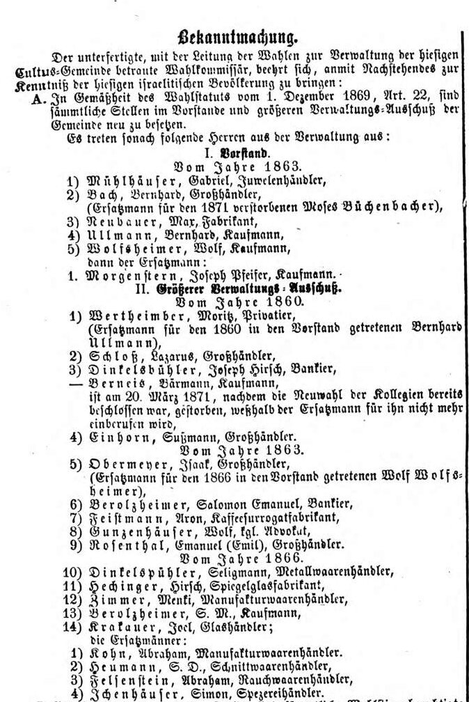 | Beschreibung | Bekanntmachung Wahl isr. Kultusgemeinde, Fürther Tagblatt 5. April 1871 | ||