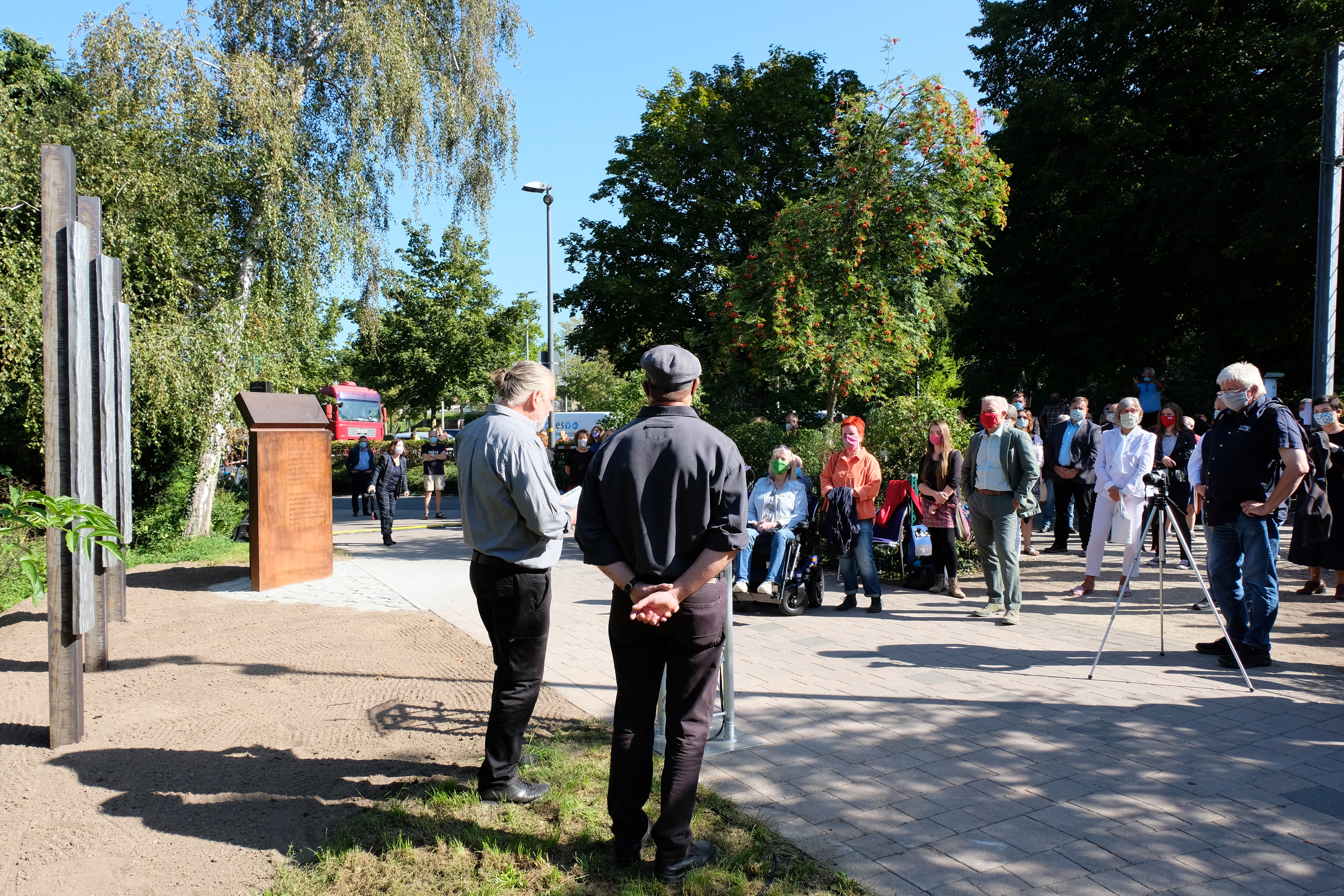 | Beschreibung | Eröffnung der Benario-Goldmann-Gedenkstätte, hier im Bild die beiden Künstler Weber und Hermann Metallgestaltung, Sept. 2020 | ||