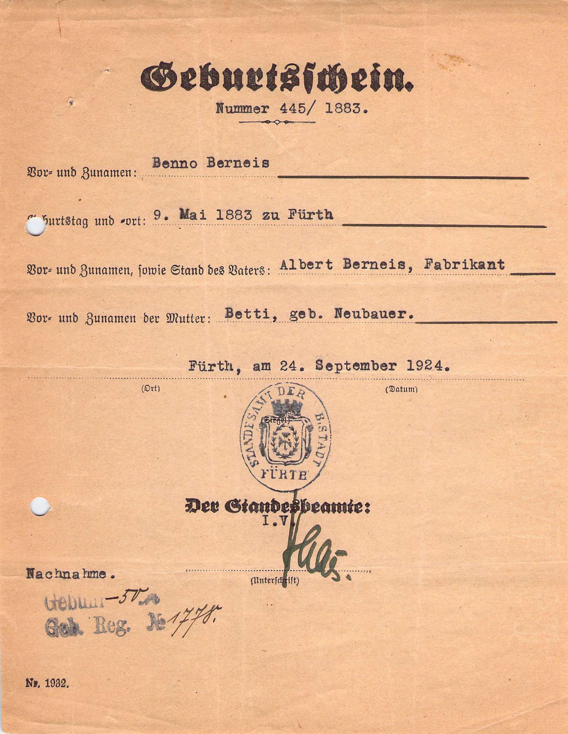 | Beschreibung | Kopie der Geburtsurkunde von Benno Berneis, 24. September 1924 | ||