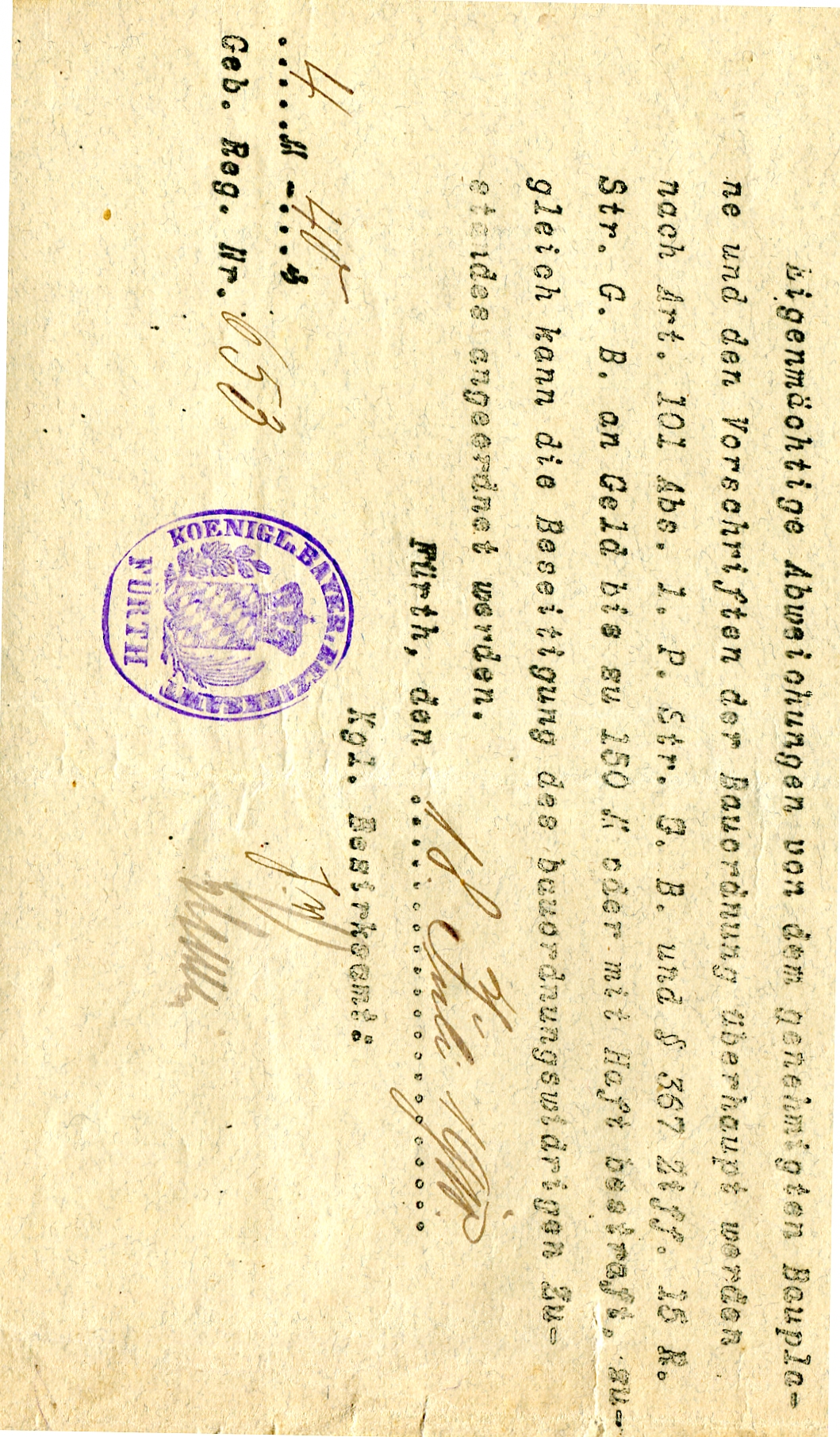 | Beschreibung | Amtliches Dokument (Ausschnitt) mit Dienstsiegel "Königl. Bayer. Bezirksamt Fürth", 1910 | ||