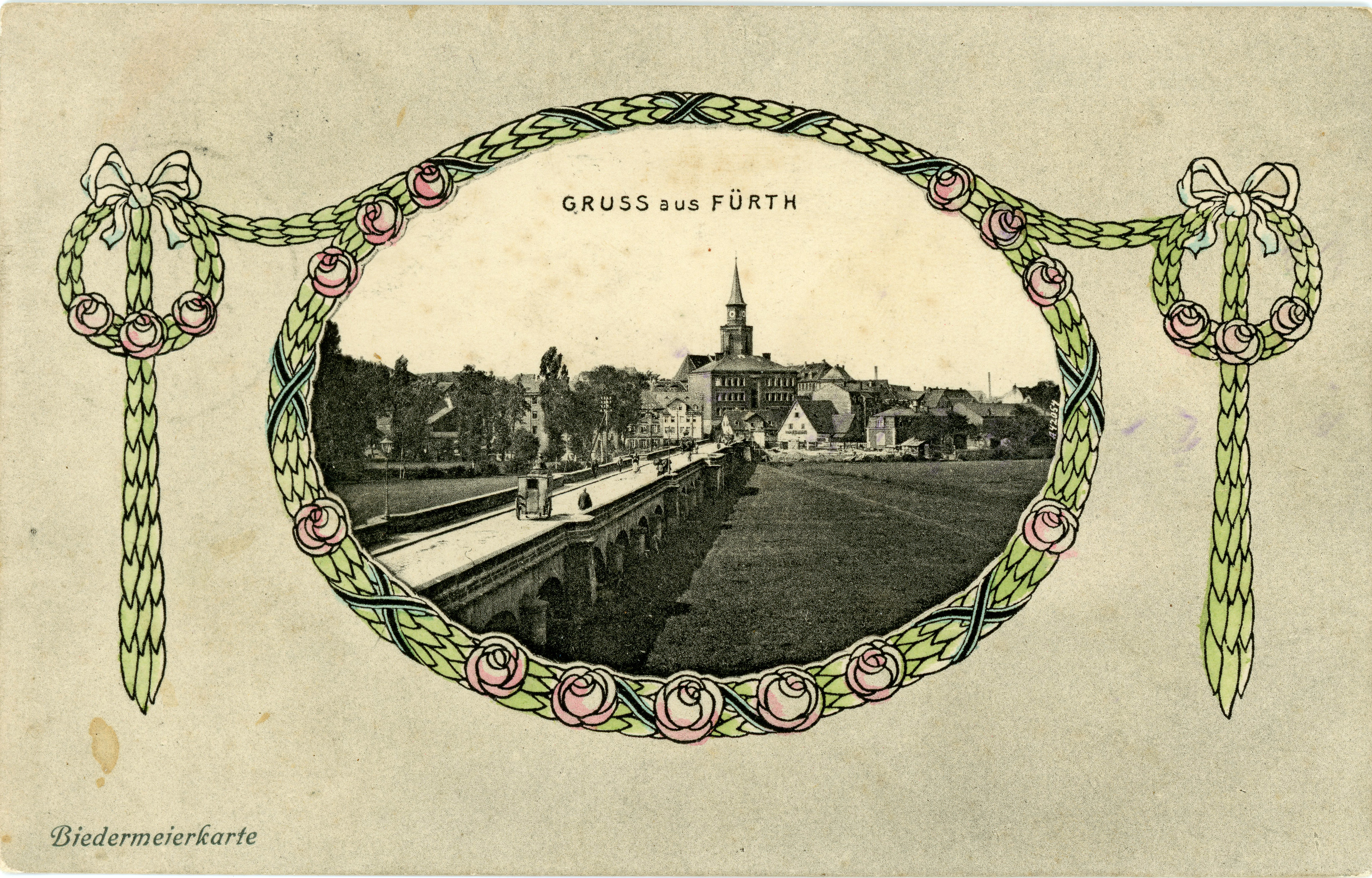 | Beschreibung | Biedermeier Ansichtskarte mit Blick von Ost nach West über die Ludwigbrücke - im Hintergrund die Fürther Altstadt mit der Kirche St. Michael, gel. 1907 | ||