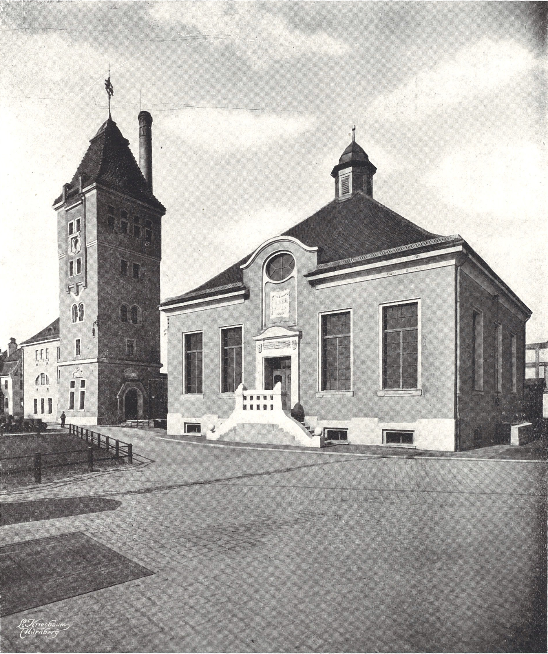 | Beschreibung | Gaswerk, Wasserturm, Uhren- und Reglerhaus, Leyher Str. 69, Aufnahme um 1907 | ||