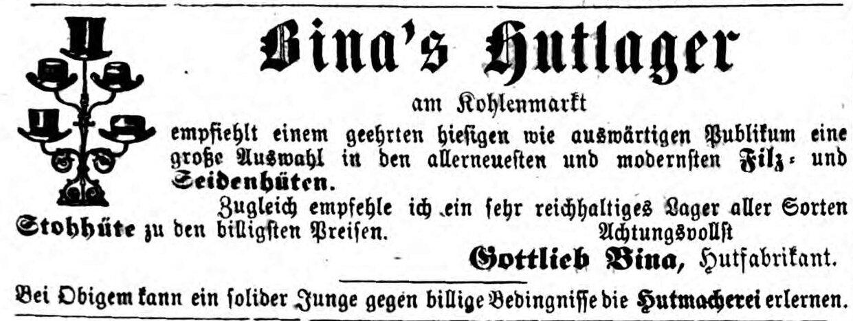 | Dateiinfo (Bild-Unterschrift und Info-Box, automatisch erstellt) | Zeitungsanzeige des Filz- und Hutfabrikanten Johann Gottlieb Bina, März 1863 Erstellungsdatum: März 1863<br>Lizenz: noc-nc-1.0 | ||