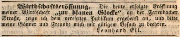 | Dateiinfo (Bild-Unterschrift und Info-Box, automatisch erstellt) | Zeitungsannonce anlässlich der Eröffnung der Wirtschaft zur blauen Glocke, Februar 1840 Über Datum: Februar 1840<br>Lizenz: noc-nc-1.0 | ||