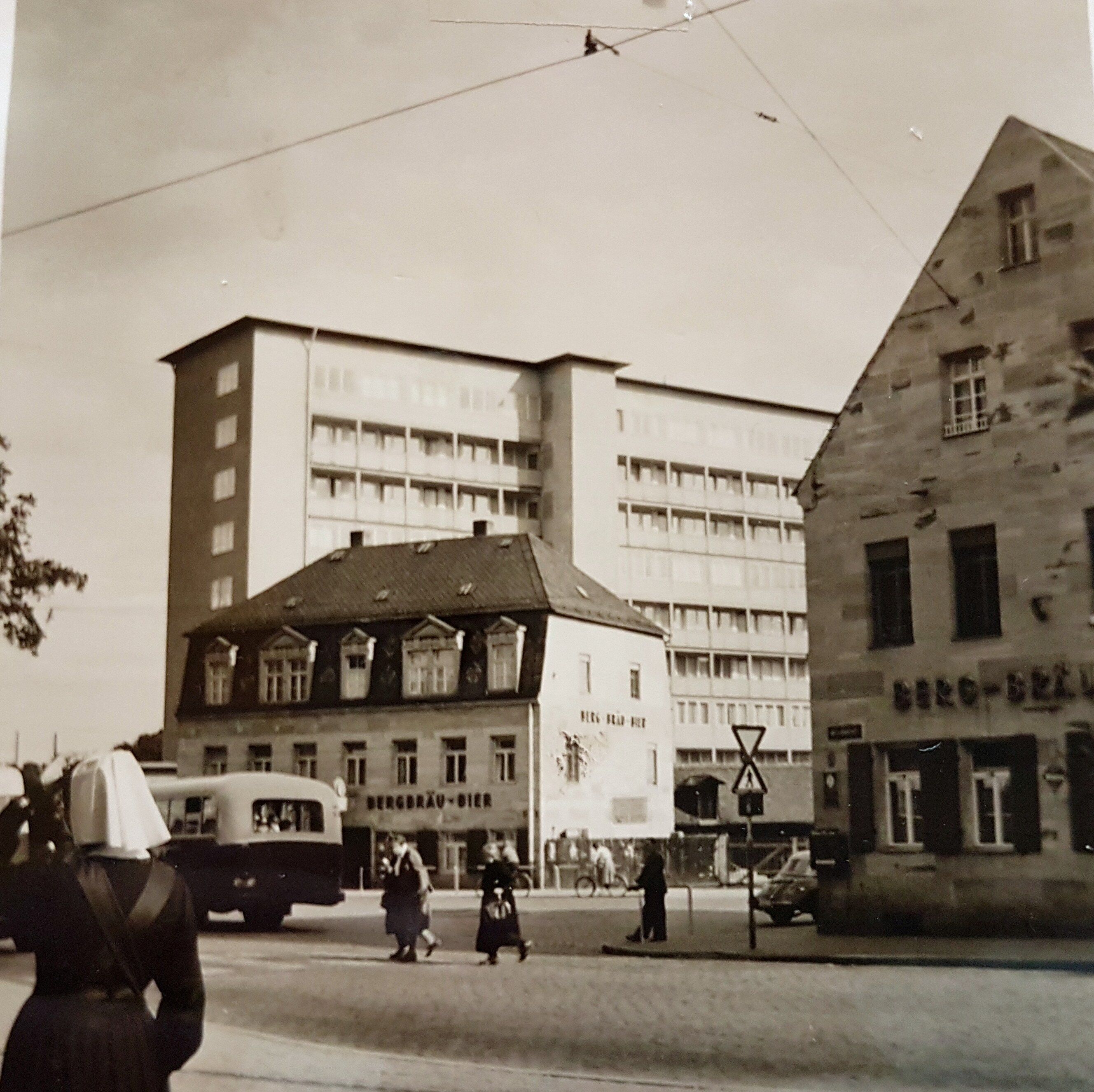| Beschreibung | Blick von der Billinganlage auf die ehem. Gaststätte Zur Blauen Glocke, Amm`sche Wirtschaft und Hochhaus Cadolzburger Str. 1/3. 1960er Jahre | ||
