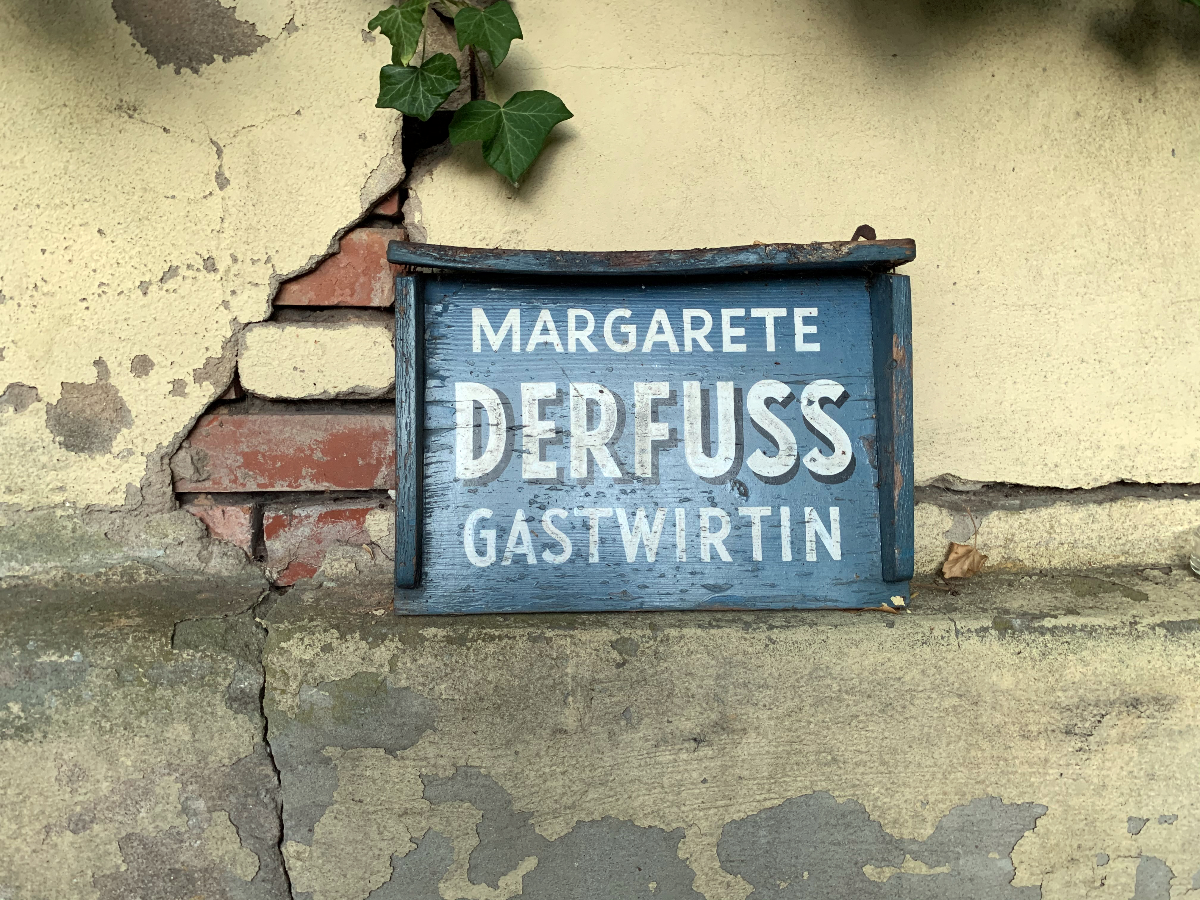 | Beschreibung | Schild mit dem Namen der ehem. Wirtin im Blauen Affen, 2020 | ||