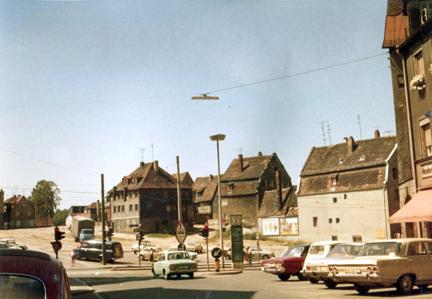 Blick vom Grünen Markt auf die Königstraße im Jahr 1974 - rechte Fassade im Bild Königstraße 40 ... Blick vom Grünen Markt auf die Königstraße im Jahr 1974 - rechte Fassade im Bild Königstraße 40 (erhalten)<br />noch mit Rückgebäude, hinter der Straßenuhr das Abbruchgelände des ehem. Geleitshauses und der Geleitsgasse<br>Urheber: Leonhard Wittmann<br>Erstellungsdatum: 1974<br>Lizenz: cc-by-sa-3.0