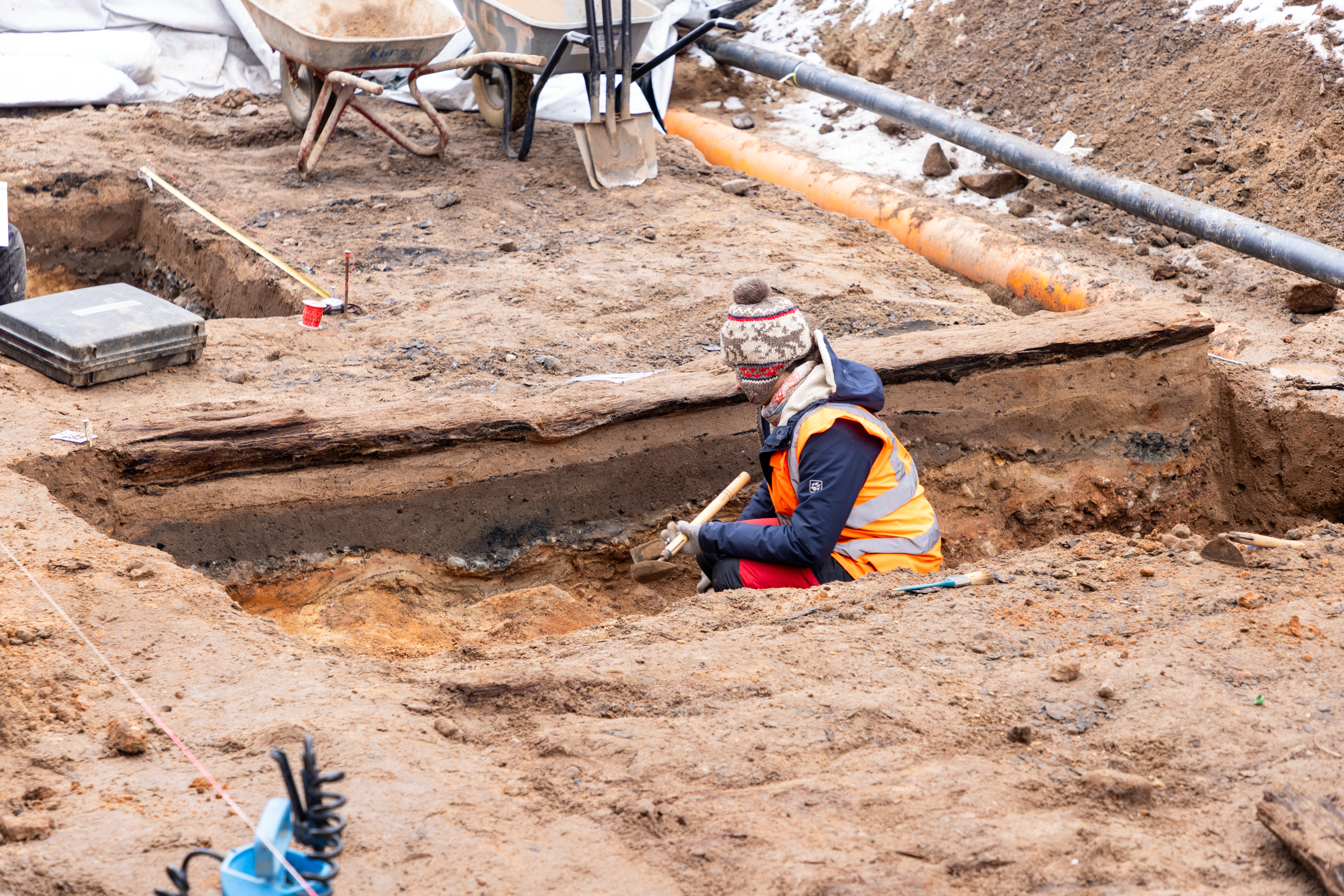 | Beschreibung | Im Schnitt gut zu erkennen: der Bohlenweg aus Holz, darunter weitere ehem. Straßen aus der Vergangenheit. Archäologische Ausgrabungsarbeiten in der Würzburg Straße in Burgfarrnbach, Dez. 2023 | ||
