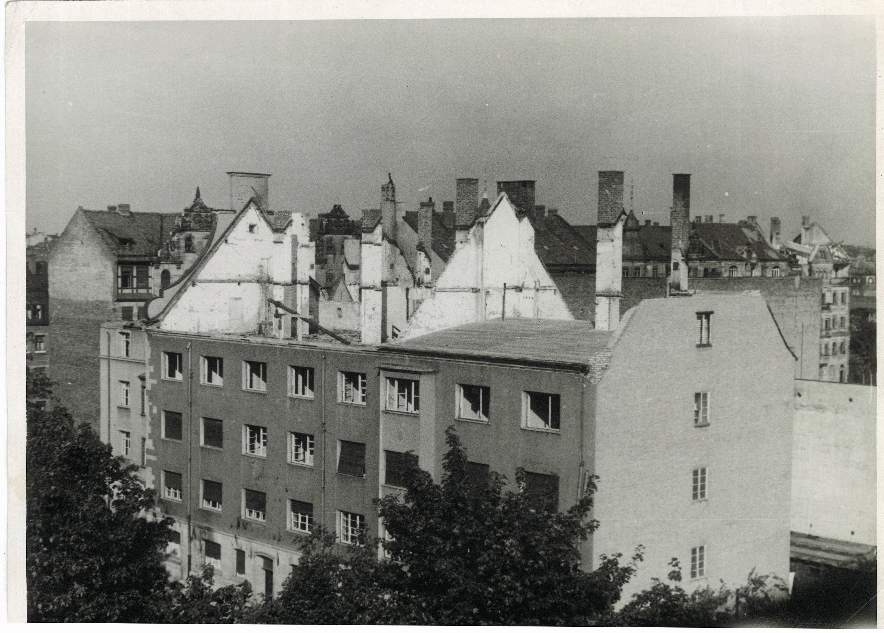 | Beschreibung | Aufnahme aus der Winklerstraße 21/23 nach einem Luftangriff (vermutlich 1943), Dächer bereits notdürftig repariert | ||