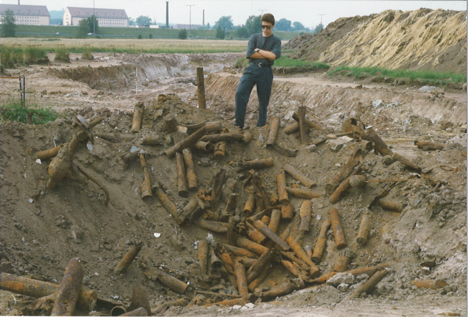 BeschreibungBau der Vershofenstraße auf Nürnberger Seite. In einem Bombentrichter entsorgte Reste der Flak-Batterie Höfen. Im Hintergrund Main-Donau-Kanal, Südwesttangente und die Speichergebäude der Johnson Barracks. Um 1995