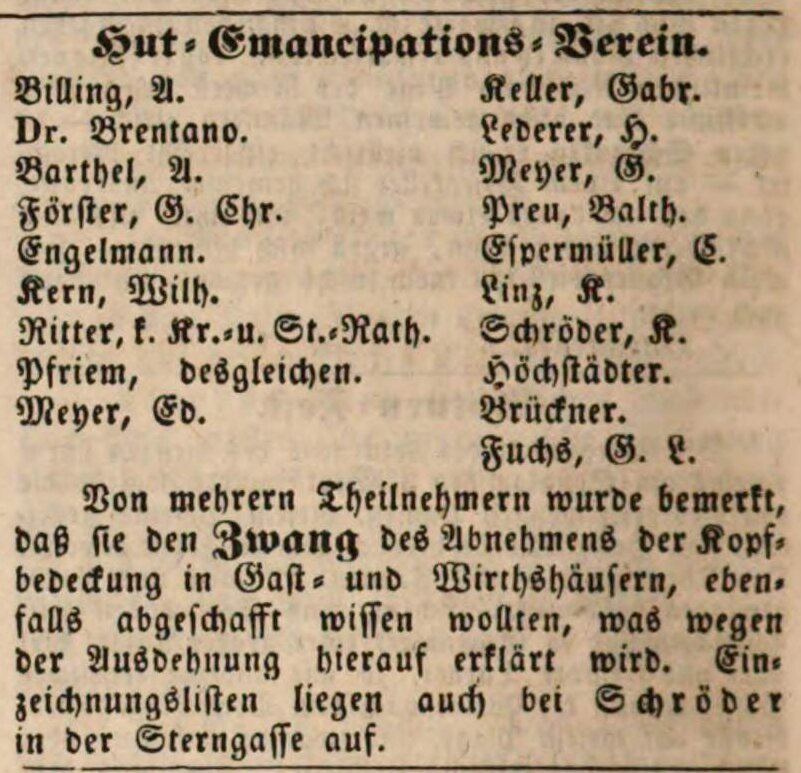 | Beschreibung | Hut-Emancipations-Verein, Fürther Tagblatt 6.9.1848 | ||
