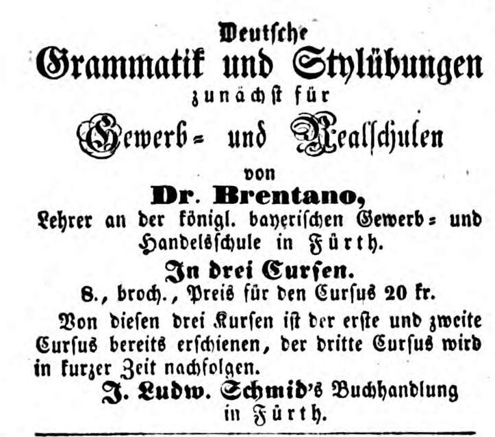 | Beschreibung | Anzeige für "Grammatik und Stilübungen", Fürther Tagblatt 23.7.1852 | ||