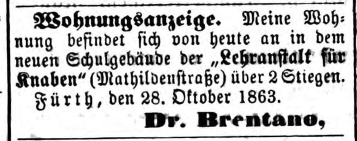 | Dateiinfo (Bild-Unterschrift und Info-Box, automatisch erstellt) | Brentano wohnt im neuen Schulgebäude, Mathildenstraße Urheber: Fürther Tagblatt<br><br>Lizenz: cc-by-sa-3.0 | ||