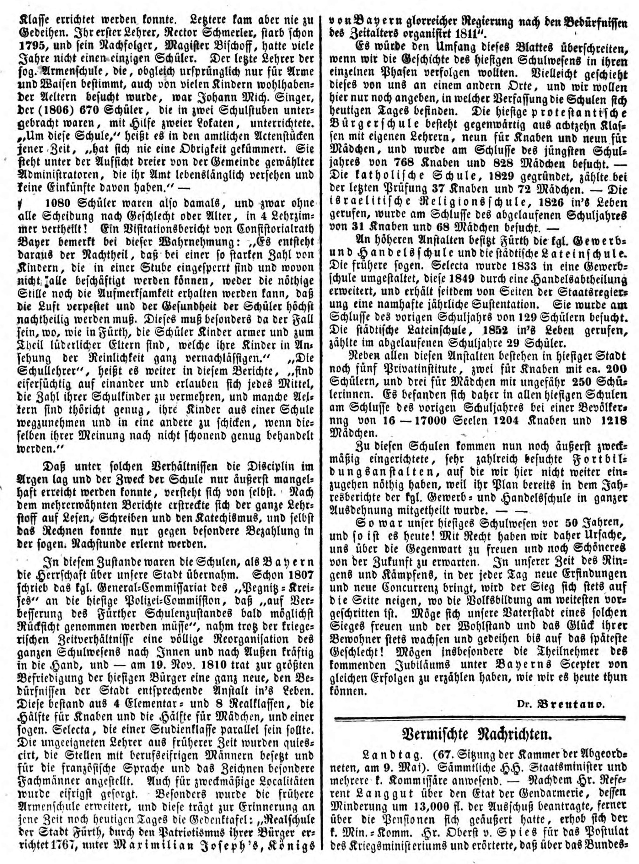| Beschreibung | Brentano über das Schulwesen in Fürth, Fürther Tagblatt 13.5.1856, 2. Teil | ||