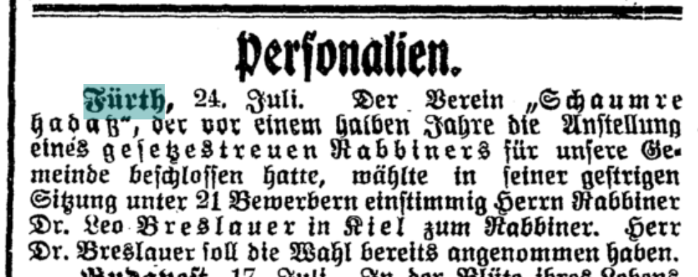 | Beschreibung | Schaumre Hadass wählt Leo Breslauer zu Rabbiner der Neuschul, Der Israelit 27. Juli 1922 | ||