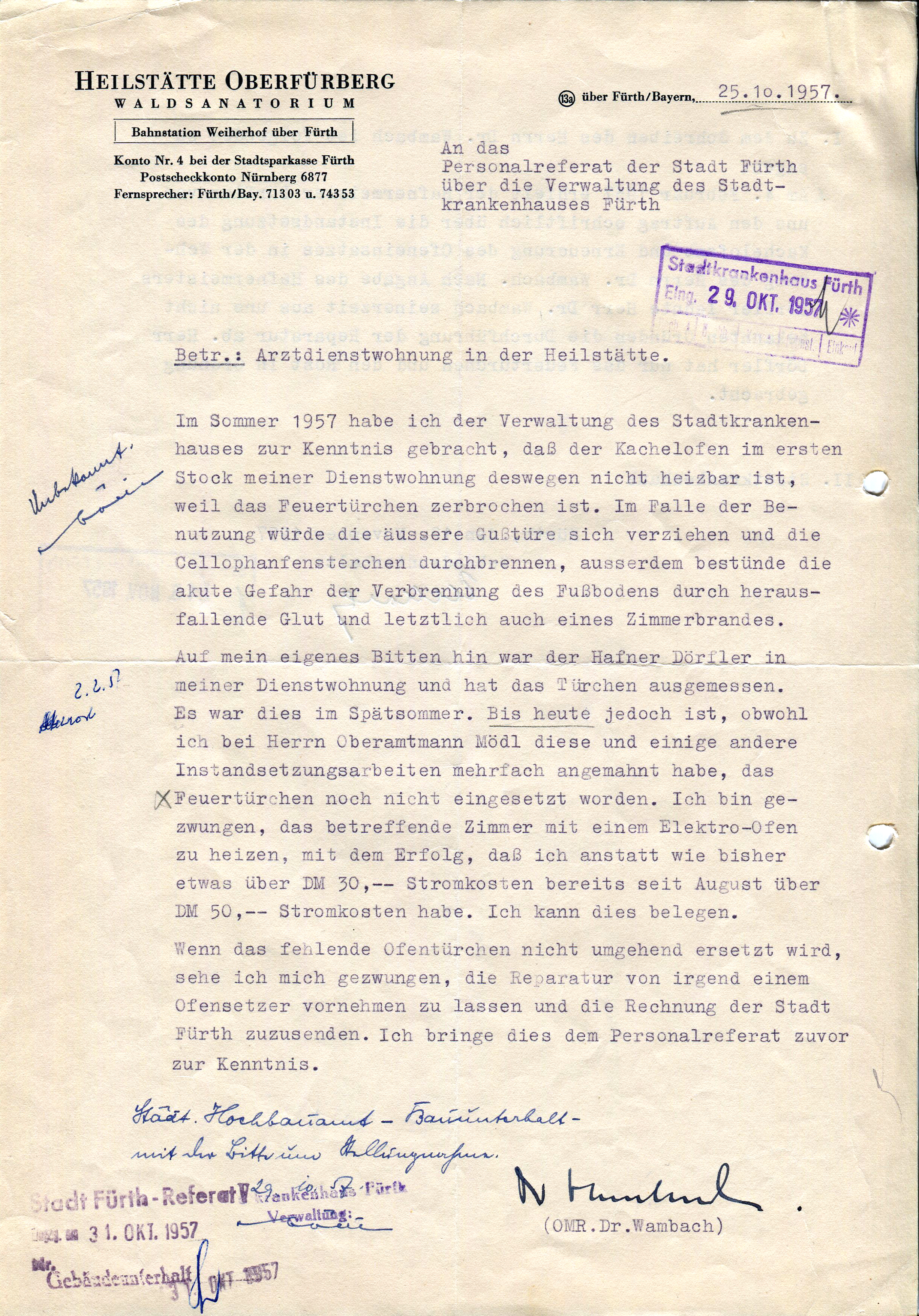 | Dateiinfo (Bild-Unterschrift und Info-Box, automatisch erstellt) | Briefkopf Waldsanatorium Heilstätte Oberfürberg mit Unterschrift von Dr. Wambach, 1957 Urheber: Stadt Fürth<br>Erstellungsdatum: 25. Oktober 1957<br>Lizenz: cc-by-sa-3.0 | ||