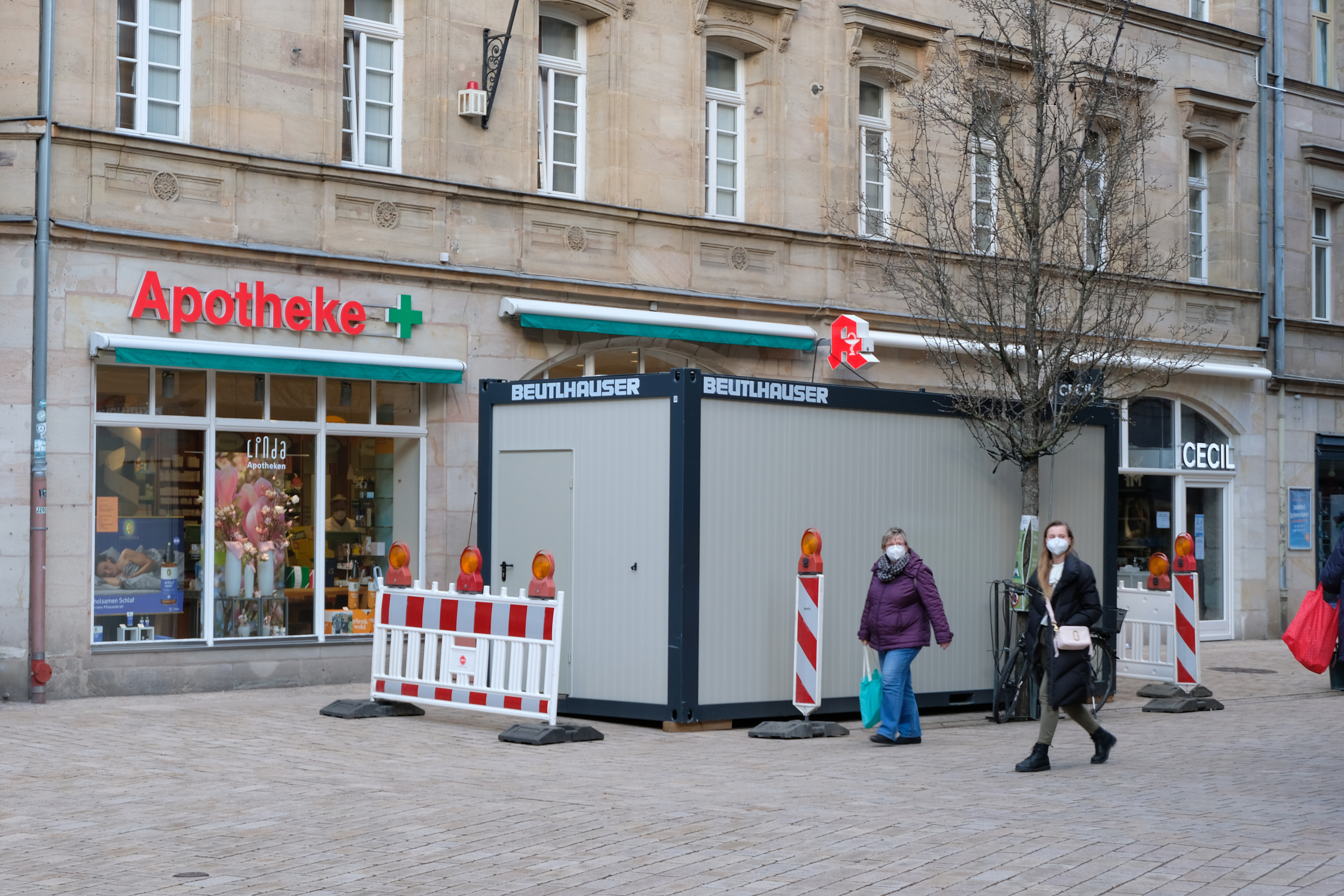 | Beschreibung | Schnellteststandorte an Apotheken zur COVID-19-Testung in Fürth - hier in der Rudolf-Breitscheid-Straße, Mrz. 2021 | ||