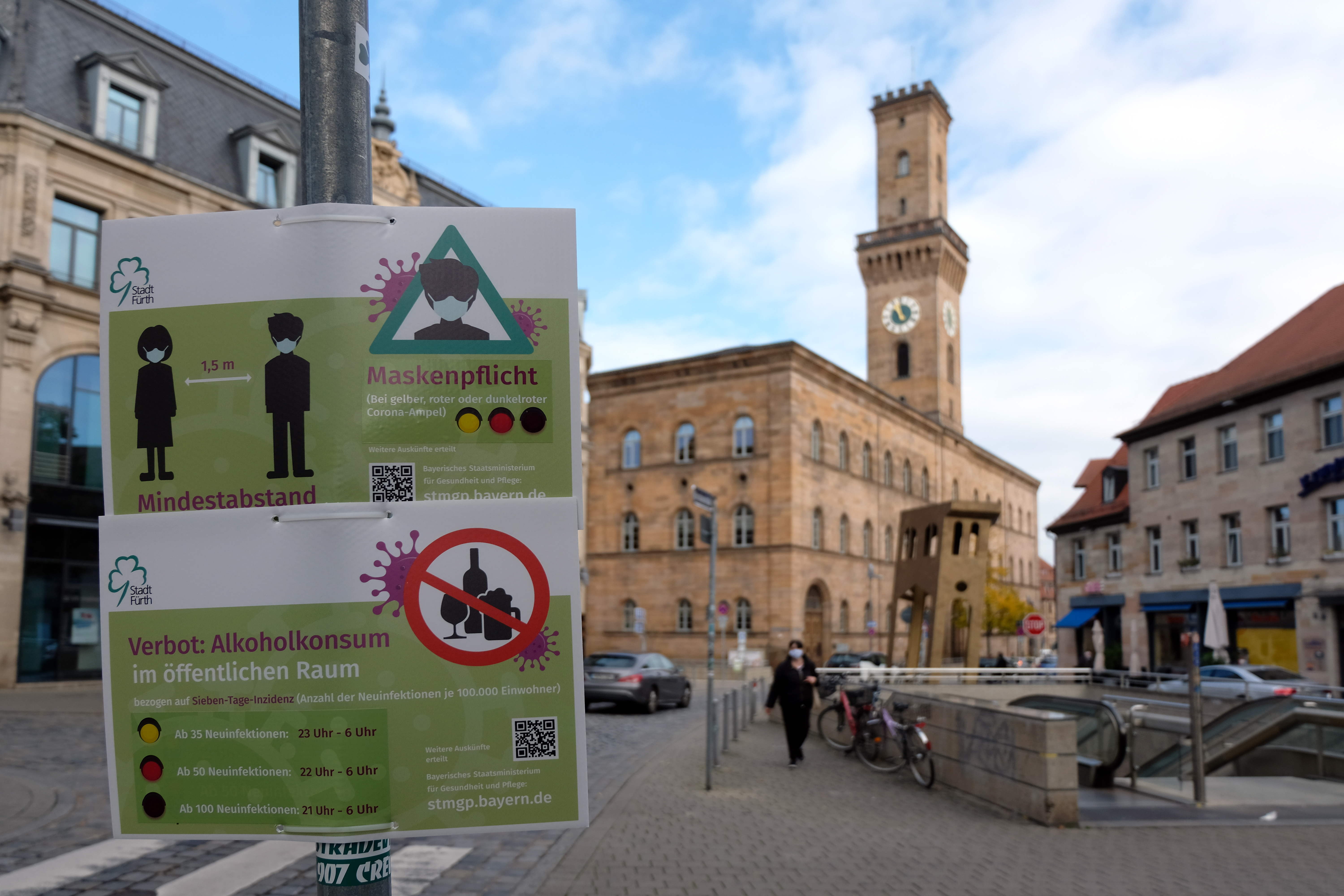| Beschreibung | Einführung der allgemeinen Maskenpflicht, nachdem in Fürth die 7-Tage-Inzidenz über 50 Neuinfektionen stieg, Okt. 2020 | ||