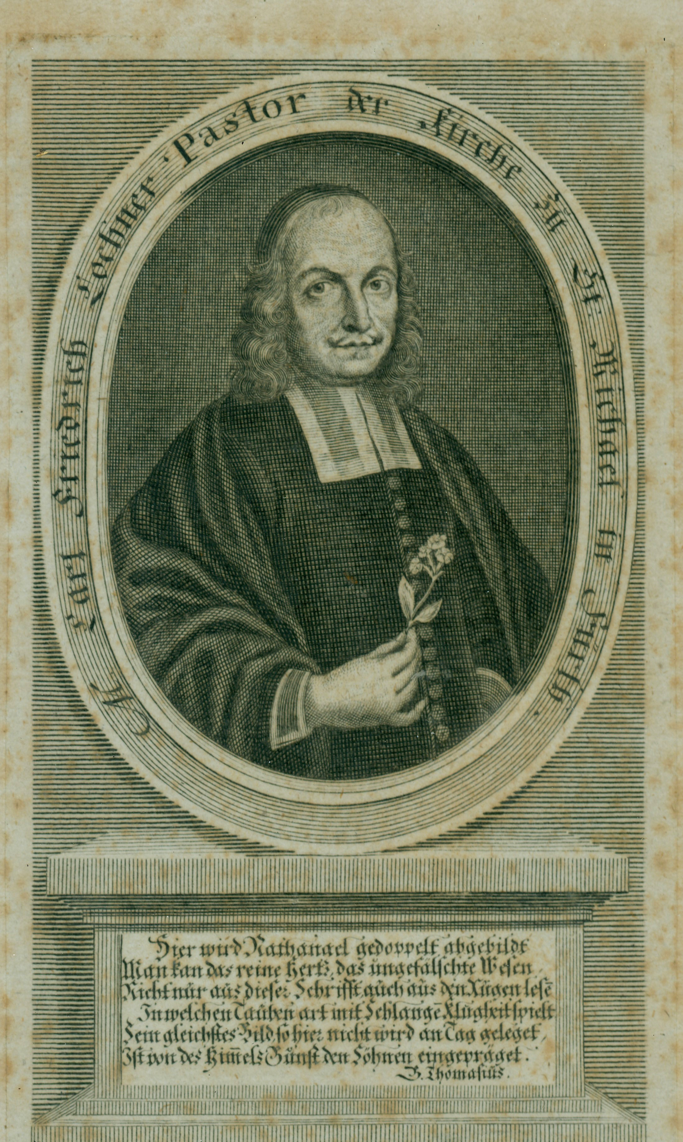 | Beschreibung | Carl Friedrich Lochner mit Schlüsselblume als Periander II. des pegnesischen Blumenordens mit der Beischrift: zu den Himmelsschätzen | ||