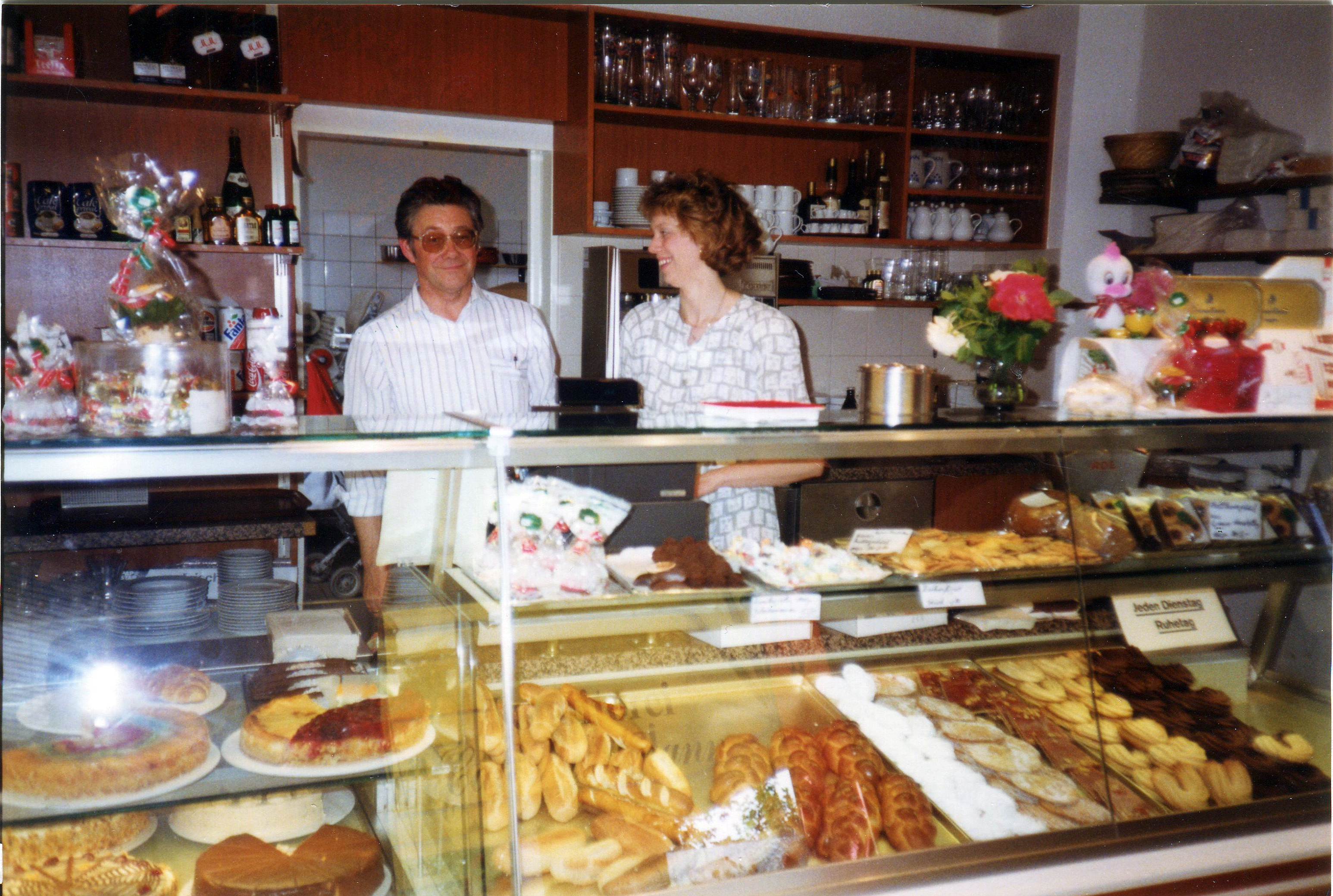 | Beschreibung | Die Verkaufstheke im ehem. Café Waldmann Team, rechts die Konditormeisterin Ursula Waldmann, ca. 1990 | ||
