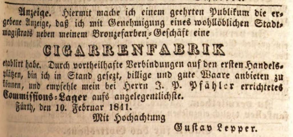 | Beschreibung | Werbeannonce des Bronzefarben- und Cigarrenfabrikanten Gustav Lepper, Februar 1841 | ||