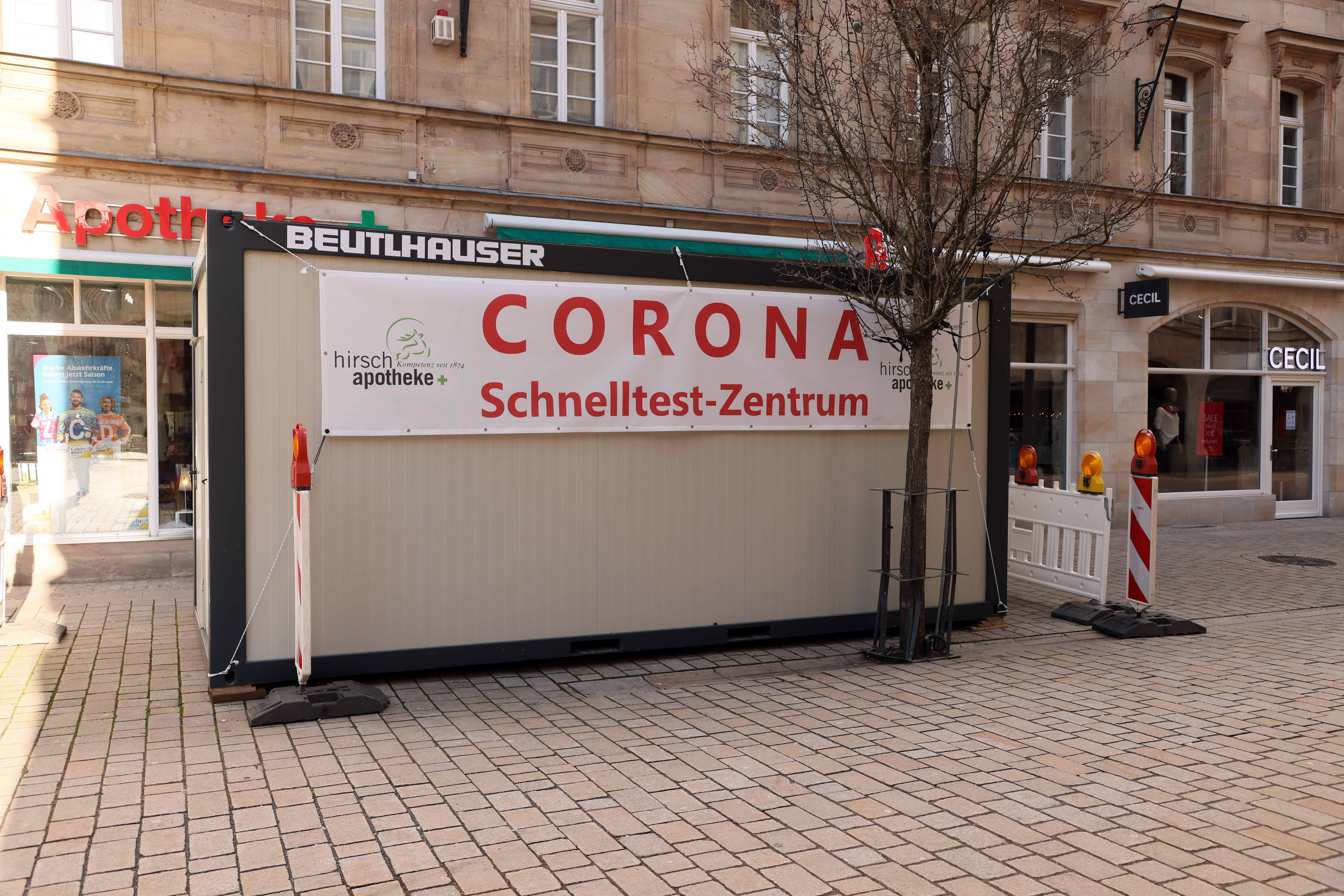| Beschreibung | Corona-Teststation vor der Hirschen-Apotheke in der Fußgänerzone, Jan. 2022 | ||