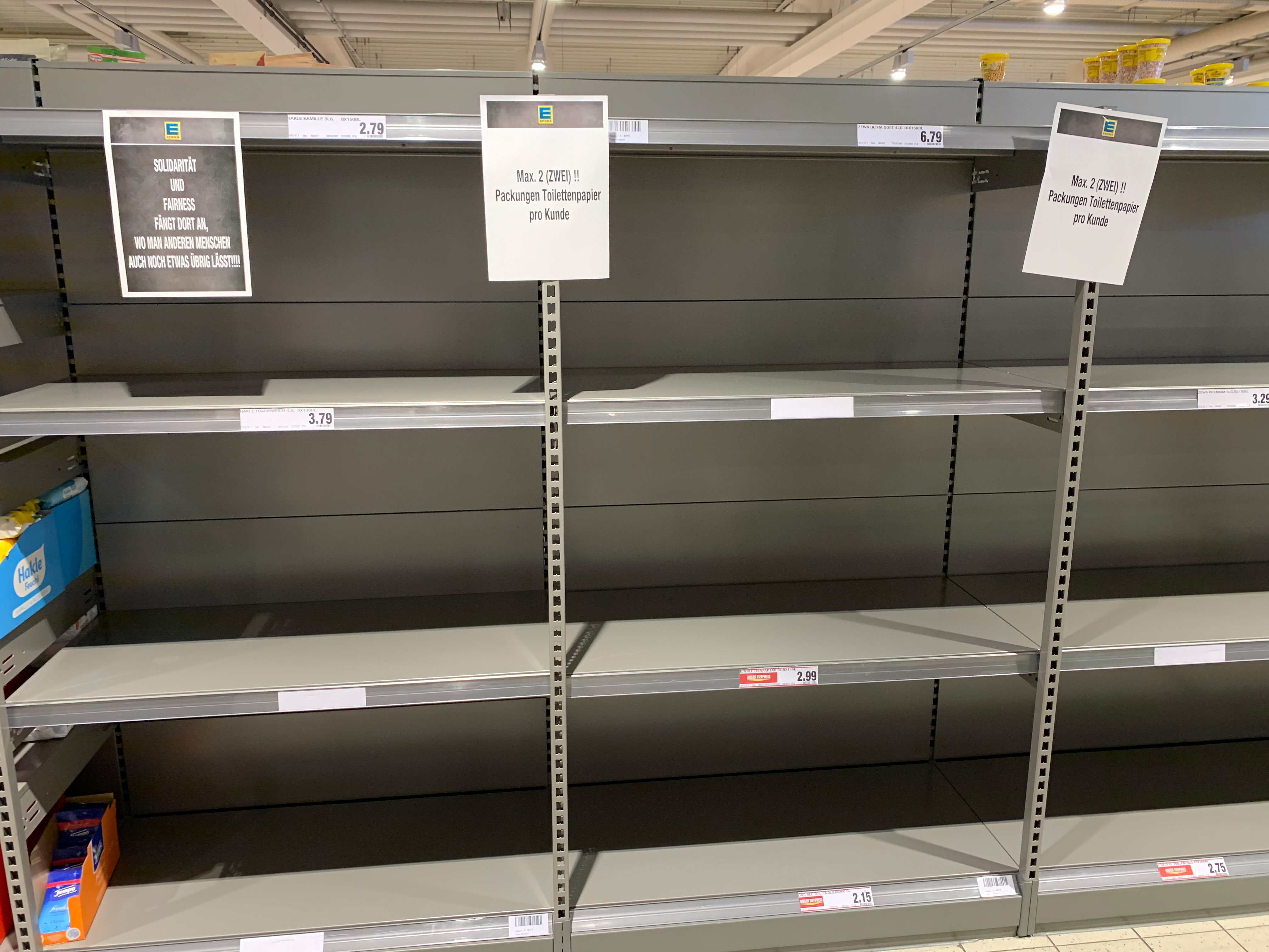 | Beschreibung | Weitere sog. Hamsterkäufe von Toilettenpapier trotz Limitierung, Mrz. 2020 | ||