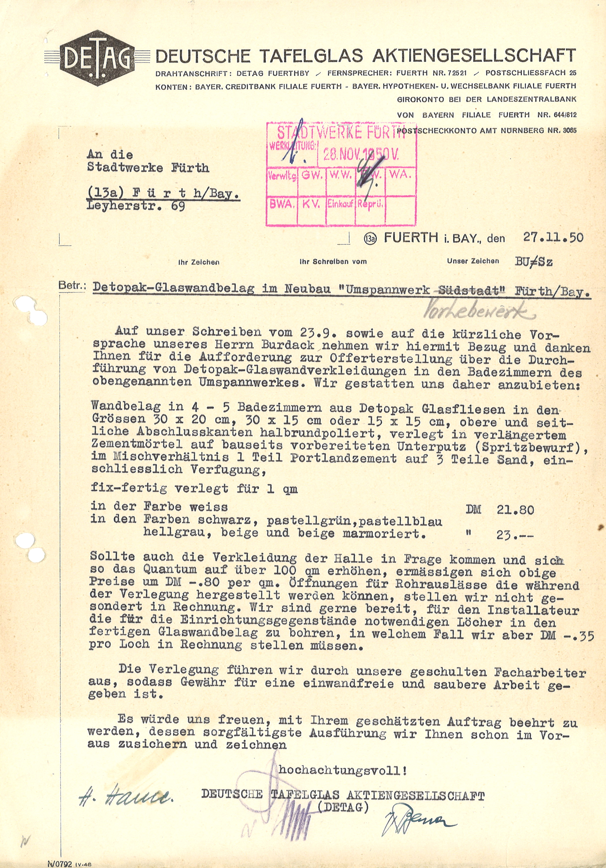| Beschreibung | Angebotsschreiben für das nach dem Krieg neu entwickelte Detopak-Glas, einem erfolglosen Konkurrenzprodukt für Keramikfließen | ||