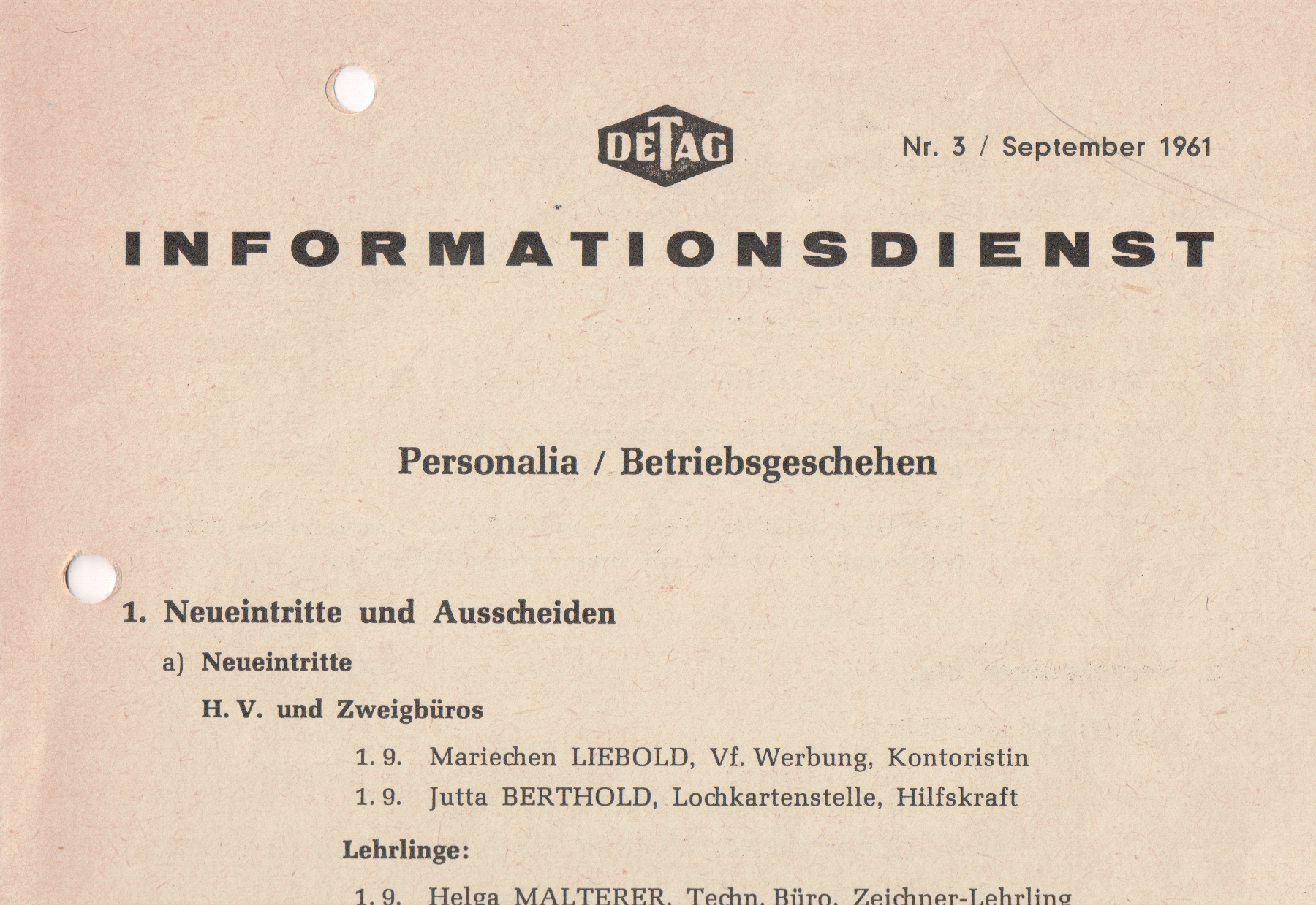 Beispiel des werksinternen Infoblattes von 1961 Urheber: DETAG<br>Erstellungsdatum: September 1961<br>Lizenz: cc-by-sa-3.0