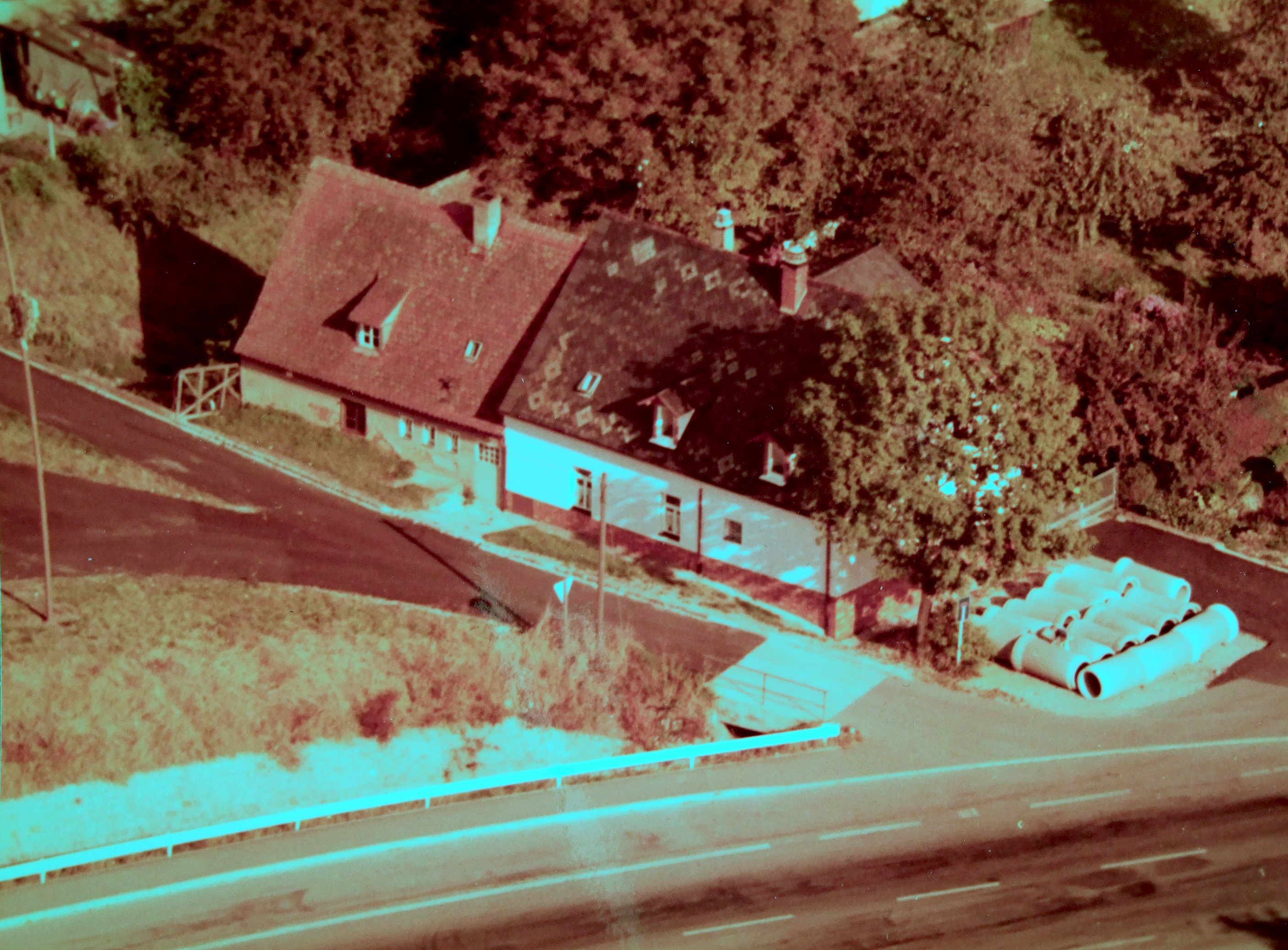 Das Bild zeigt das Gasthaus etwa 1970, schiefergedeckt mit schönen Mustern. Die davor jahrelang gelagerten Betonrohre waren für die Verrohrung des Lohgrabens vorgesehen, um dort den Wendeplatz der Buslinie, heute 175, entstehen zu lassen.