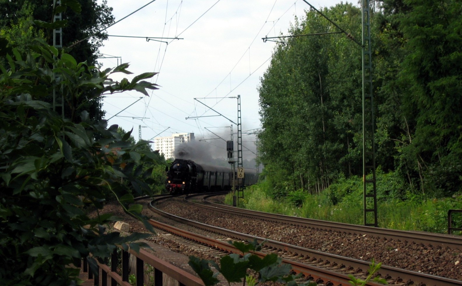 mit Volldampf voraus über die Brücke Erlanger Straße 2007. Im Hintergrund das Hochhaus der WBG Fürth auf der Schwand Albrecht-Dürer-Straße 3.