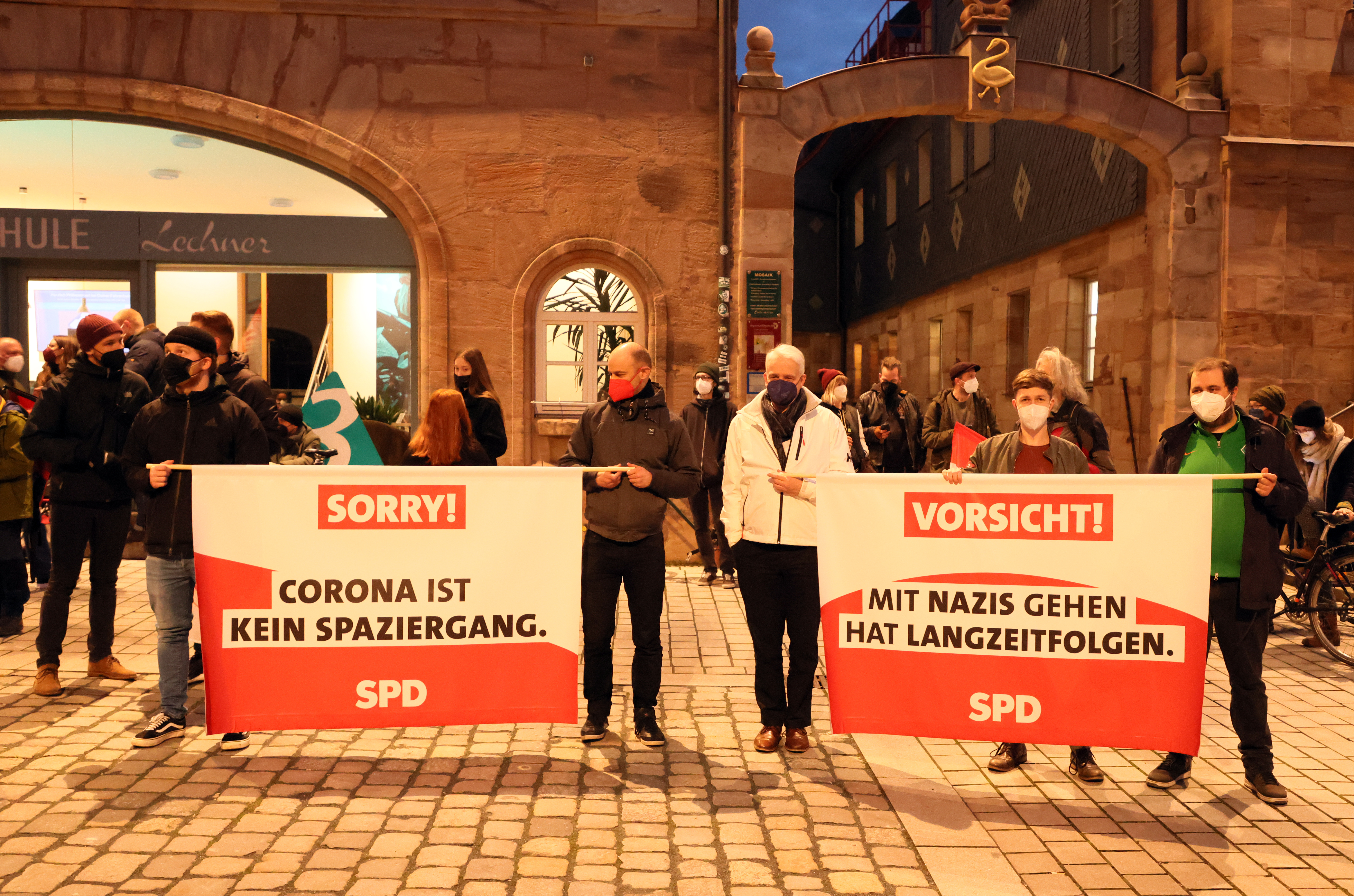 BeschreibungDemonstration „Fürth bleibt solidarisch“ in der Innenstadt für „Impfstoffe patentfrei statt Verschwörungsmythen“, Feb. 2022