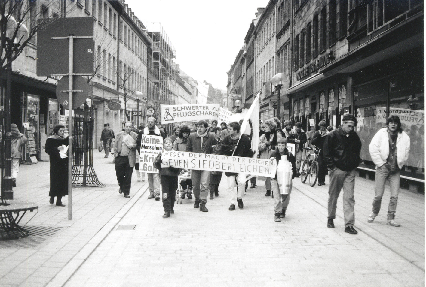 | Beschreibung | Anti-Kriegsdemo gegen den Golfkrieg in der Fußgängerzone. Aufnahme: Januar 1991. | ||