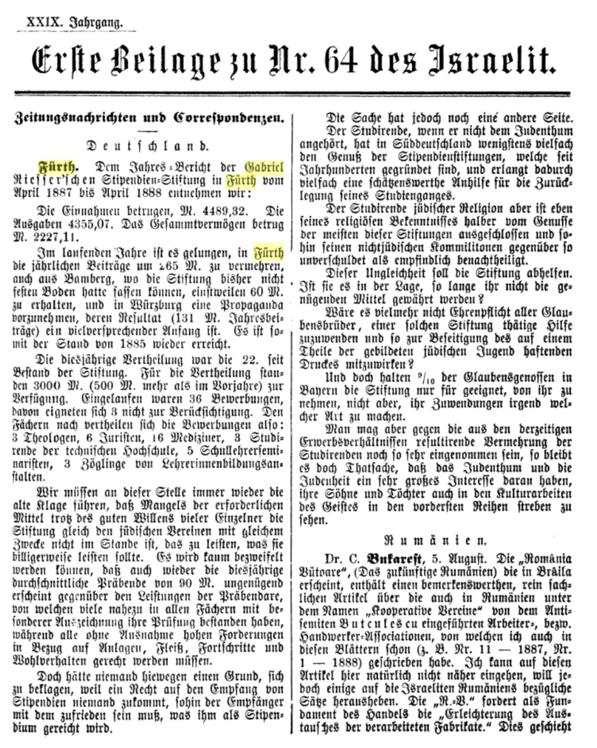 BeschreibungArtikel zum Jahresbericht der Gabriel Riesser´schen Stripendienstiftung, Der Israelit vom 9. August 1888
