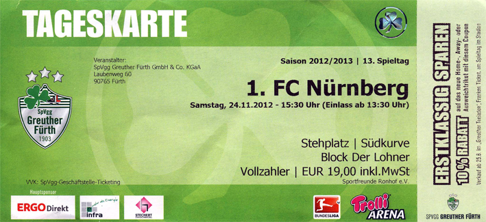 | Beschreibung | Eintrittskarte zum ersten Derby in der 1. Bundesliga zwischen dem 1. FC Nürnberg und der SpVgg Fürth (2012/2013). | ||