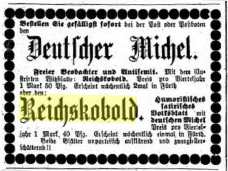 Anzeige Deutscher Michel und Reichskobold Urheber: Pfälzer Zeitung<br><br>Lizenz: CC BY-SA 3.0