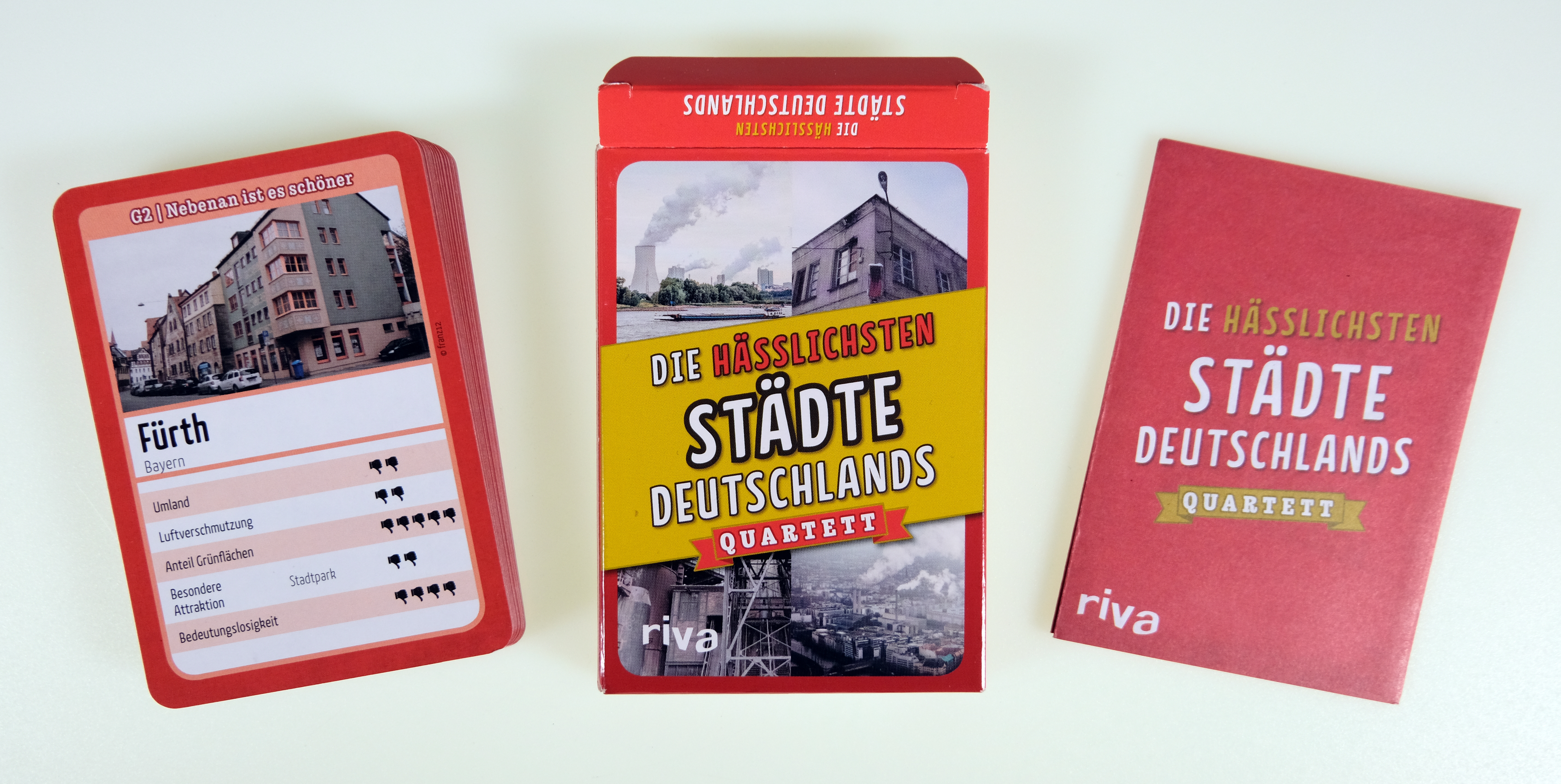 | Dateiinfo (Bild-Unterschrift und Info-Box, automatisch erstellt) | Die hässlichsten Städte Deutschlands (Quartett), 2018 Urheber: Riva Verlag<br>Erstellungsdatum: 2018<br>Über Datum: 2023<br>Lizenz: copyright | ||