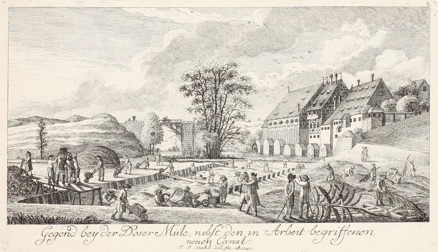 | Beschreibung | Gegend bey der Doser Müle, nebst den in Arbeit begriffenen neuen Canal (im Hintergrund die Dooser Brücke), um 1785 | ||